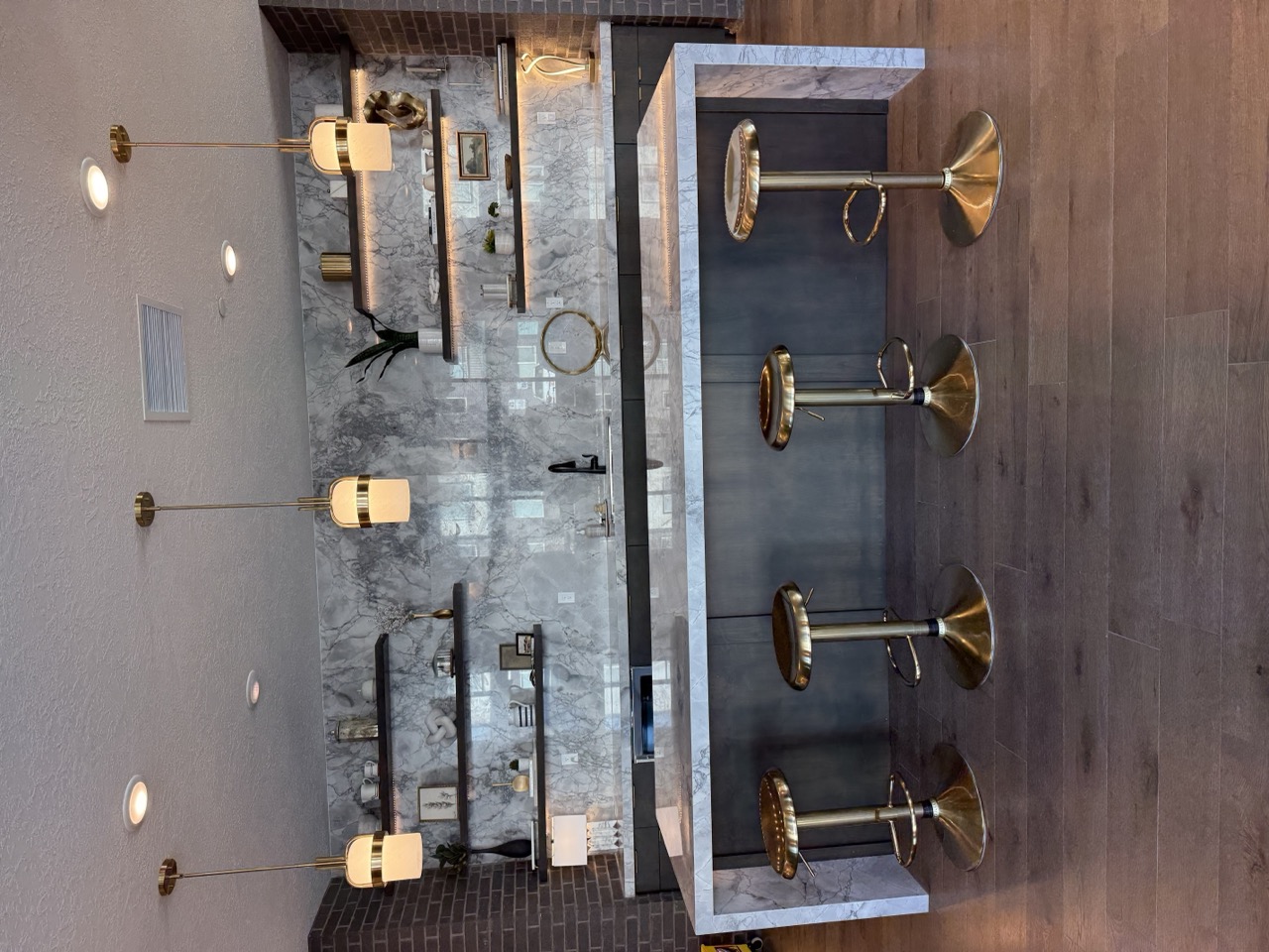 Quartz and solid surface. Measured, cut, and installed. Waterfalls and pony walls.
